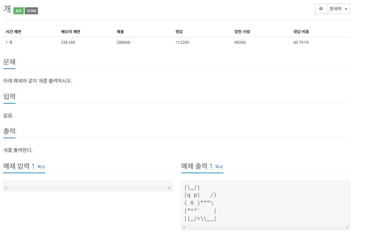 문제 아래 예제와 같이 개를 출력하시오. 입력 출력 예제 입력 1 복사 예제 출력 1 복사 |\_/| |q p| /} ( 0 )"""\ |"^"` | ||_/=\\__|...