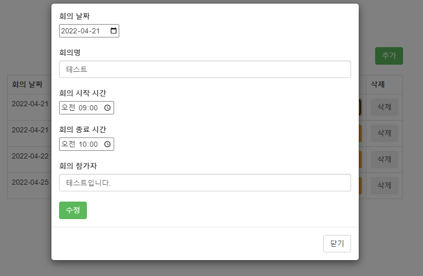 * 마지막 부분의 '닫기 버튼 눌렀을 때 reload' 를 해준 이유는 수정 모달이 추가 모달을 그대로 이용하는것이기 때문에