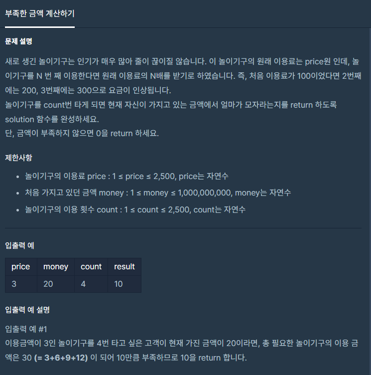 프로그래머스 코딩테스트 연습 Level.1 - 부족한 금액 계산하기