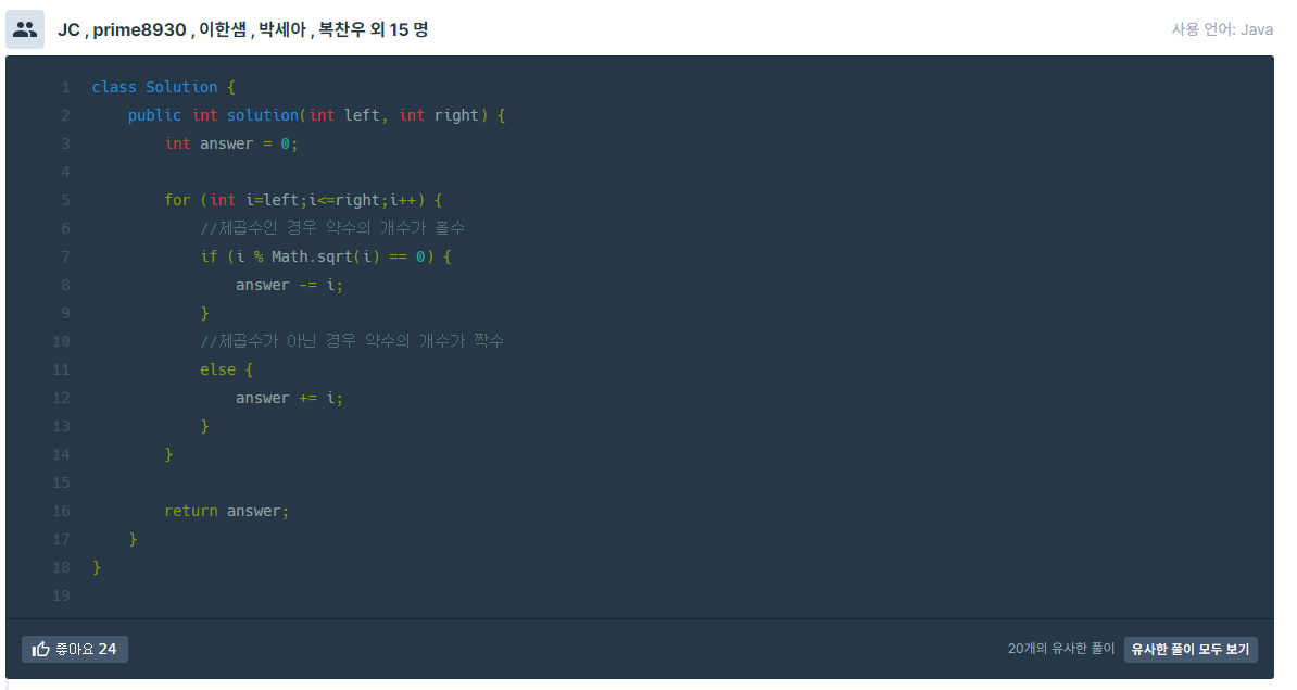7. [JAVA] 프로그래머스 코딩테스트 연습 Level.1 - 약수의 개수와 덧셈 / 다른 사람의 풀이 본문