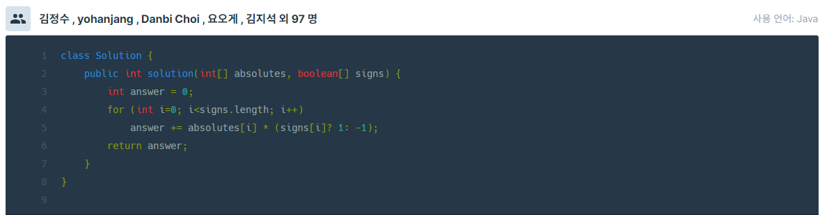8. [JAVA] 프로그래머스 코딩테스트 연습 Level.1 - 음양 더하기 / 다른 사람의 풀이 본문
