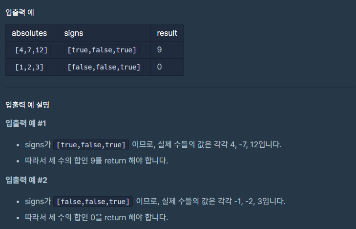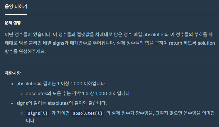 프로그래머스 코딩테스트 연습 Level.1 - 음양 더하기