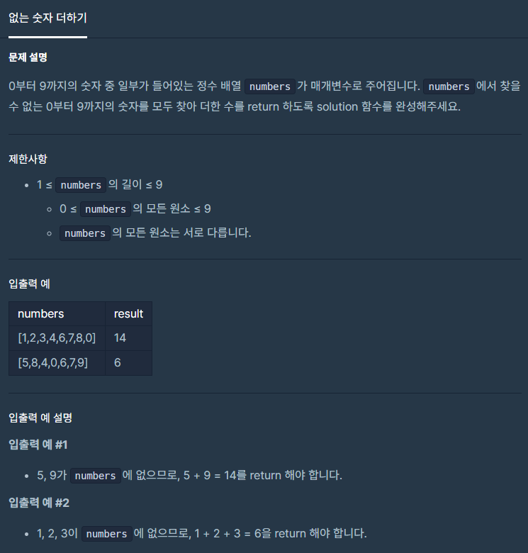 프로그래머스 코딩테스트 연습 Level.1 - 없는 숫자 더하기