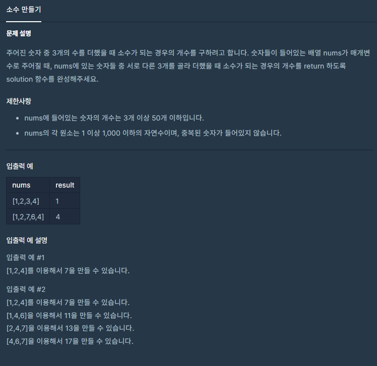 프로그래머스 코딩테스트 연습 Level.1 - 소수 만들기