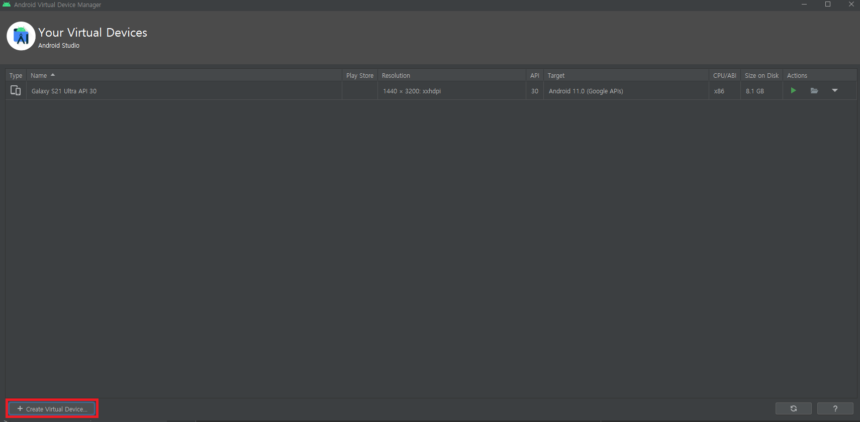 ⑤ 왼쪽 하단의 Create Virtual Device 를 클릭해줍니다.