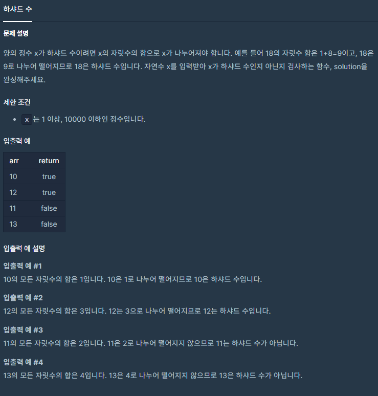 프로그래머스 코딩테스트 연습 Level.1 - 하샤드 수
