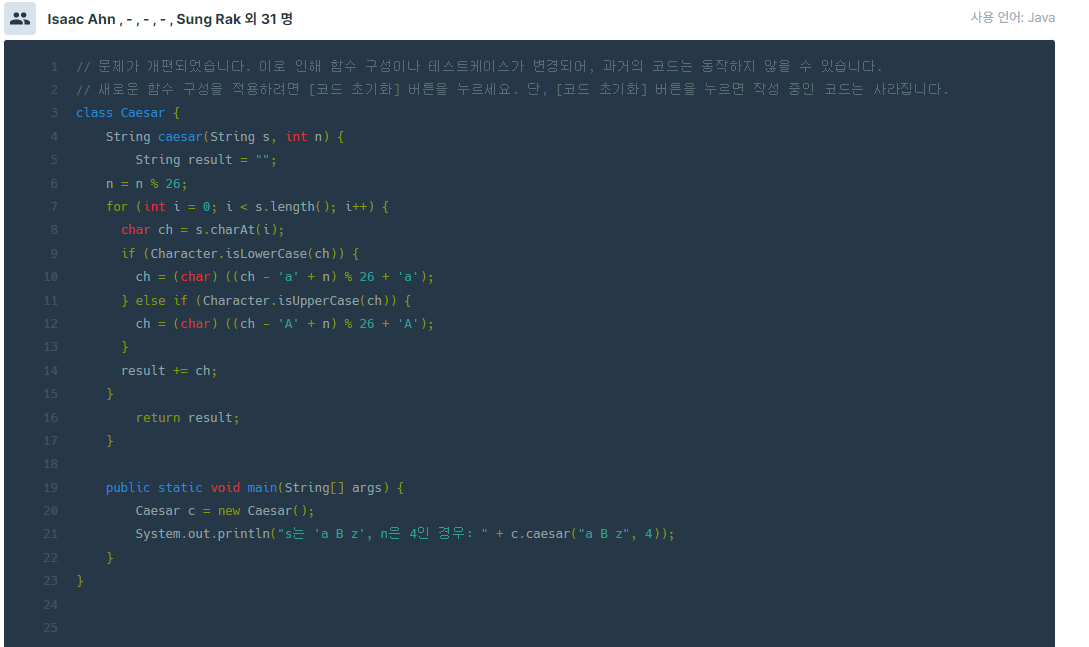 25. [JAVA] 프로그래머스 코딩테스트 연습 Level.1 - 시저 암호 / 9번 빼고 실패 해결 / 다른 사람의 풀이