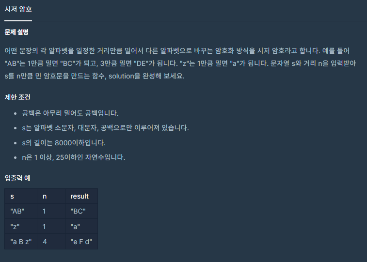프로그래머스 코딩테스트 연습 Level.1 - 시저 암호