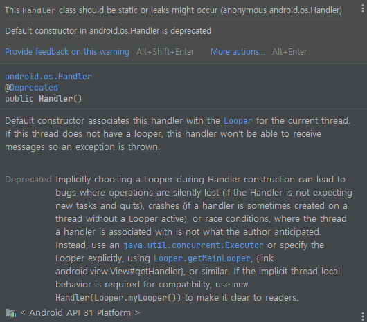 기존에 작성되어있는 소스 코드를 분석하다가 생성자에 아무것도 넣어주지 않았던 Handler에 줄이 쳐져있었고, 확인해보니 해당 Handler가 Deprecated 된 것을 알았습니다.