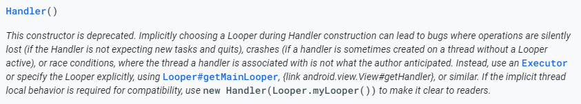 이 생성자는 더 이상 사용되지 않습니다. 핸들러 생성 중 Looper를 암시적으로 선택하면 작업이 자동으로 손실되는 버그(Handler가 새 작업을 기대하지 않고 종료되는 경우), 충돌(Looper가 활성화되지 않은 스레드에서 핸들러가 생성되는 경우) 또는 경쟁 조건이 발생하는 버그가 발생할 수 있습니다. 핸들러가 연결된 스레드는 작성자가 예상한 것과 다릅니다. 대신 , {link android.view.View#getHandler} 등을 Executor사용하여 명시적으로 Looper를 사용 하거나 지정하세요 Looper#getMainLooper. 암시적 스레드 로컬 동작이 호환성 new Handler(Looper.myLooper())을 위해 필요한 경우 독자에게 명확하게 하기 위해 사용 합니다.