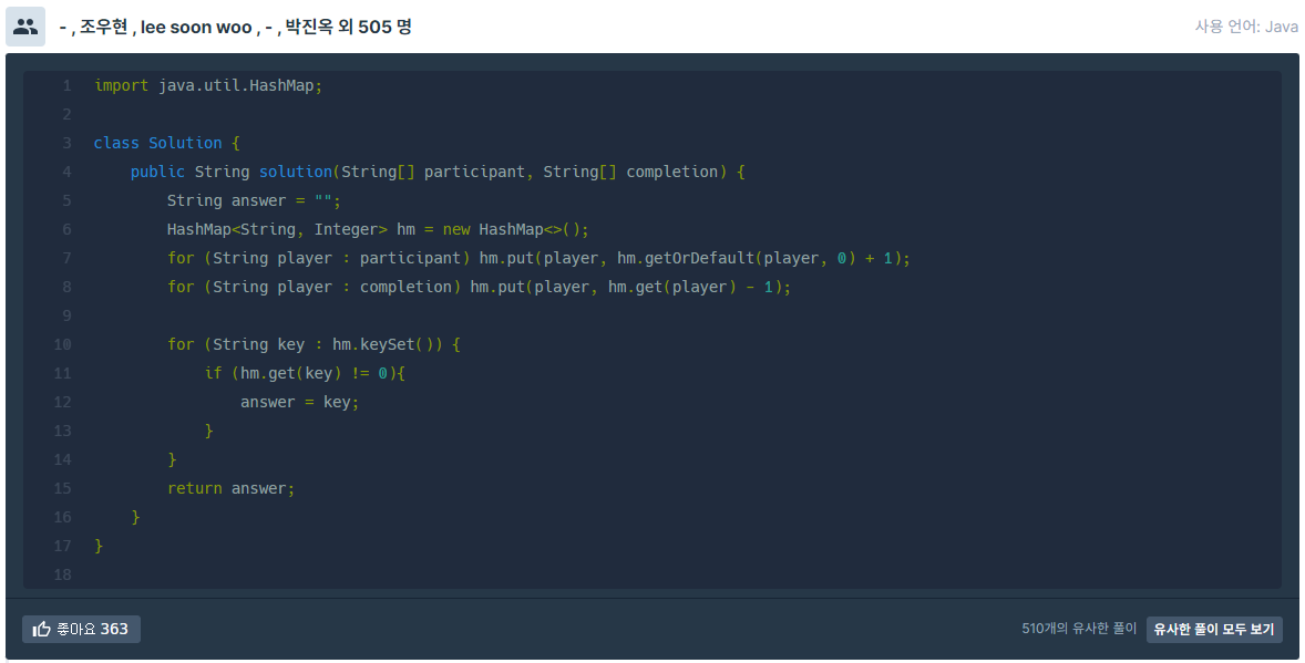 27. [JAVA] 프로그래머스 코딩테스트 연습 Level.1 - 완주하지 못한 선수 / 효율성 실패 해결 / 다른 사람의 풀이 본문