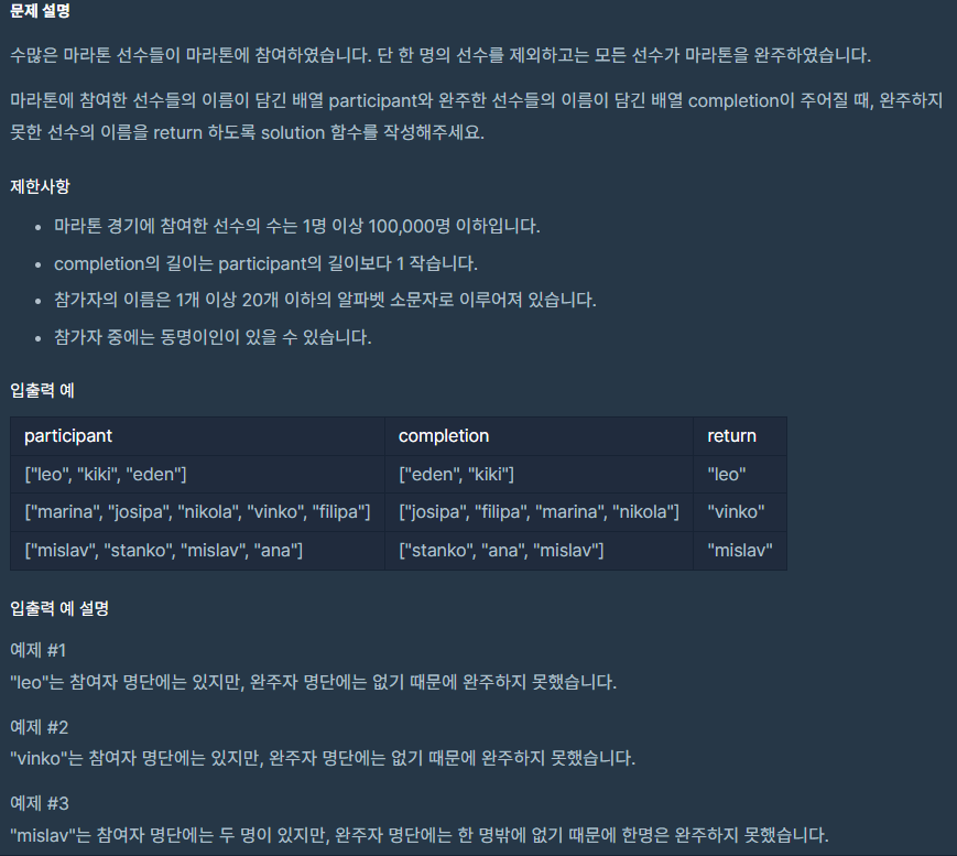 프로그래머스 코딩테스트 연습 Level.1 - 완주하지 못한 선수