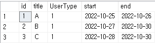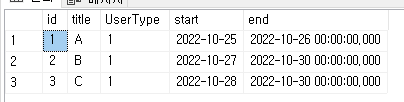 이때, 저의 DB를 살펴보면, 시작날짜와 종료날짜가 다른 경우가 있는데 위의 결과물은 하루만 나오게 되었습니다.