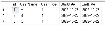 SELECT id, UserName as title, UserType, StartDate as start, EndDate as [end]