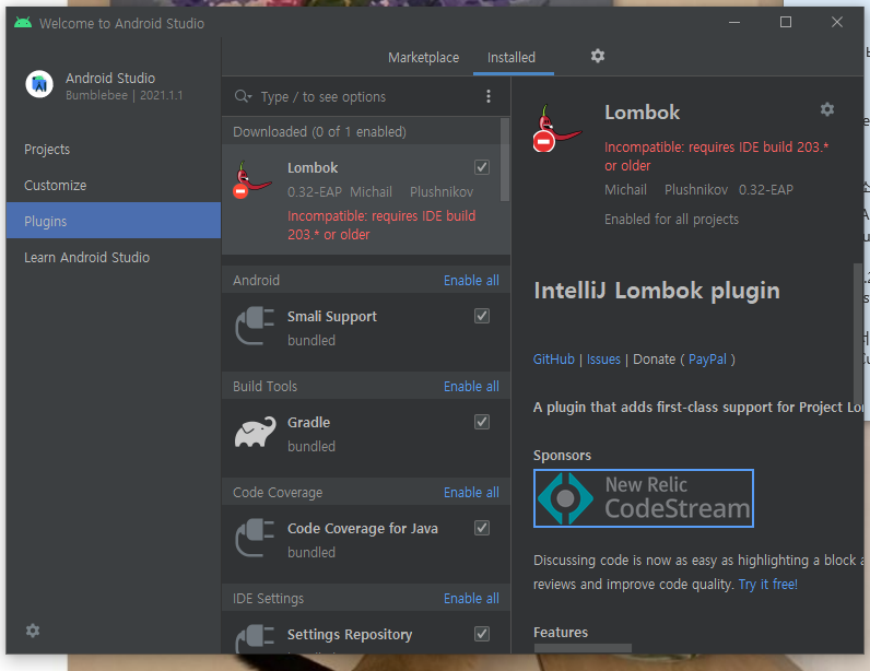 5. [Android] Incompatible: requires IDE build 203.* or older / Android Studio Bumblebee (2021.1.1) 업데이트 후 Lombok 오류 본문